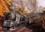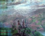 2004Commissioned piece for wedding gift. Tartan in background is old 'Smith' tartan. The castle is 'Sinclair' castle in scotland. The man on horseback is Robert the Bruce, king of scotland and peoples hero.